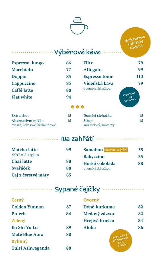 Ať už máte chuť na espresové nápoje či filtrovanou kávu, oboje připravujeme z výběrových zrnek radotínské pražírny Kafe King.